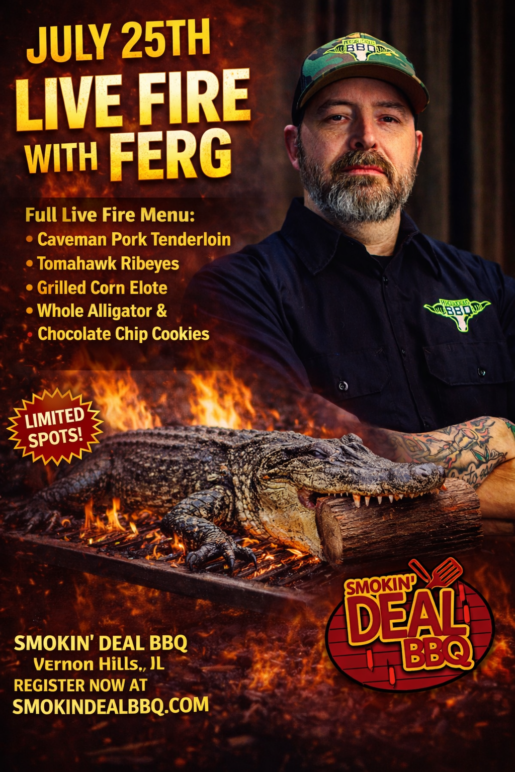 PLEASE INDICATE IF YOU HAVE ANY DIETARY RESTRICTIONS via email at info@smokindealbbq.com. If you are unable to attend a class, you must cancel at least 5 days in advance to receive a refund, retain a credit, or transfer to another class. Without the five-day notice, the registration fee is non-refundable. You may, however, send someone to class in your place. Please notify us of your substitution by calling (847) 393-7065.