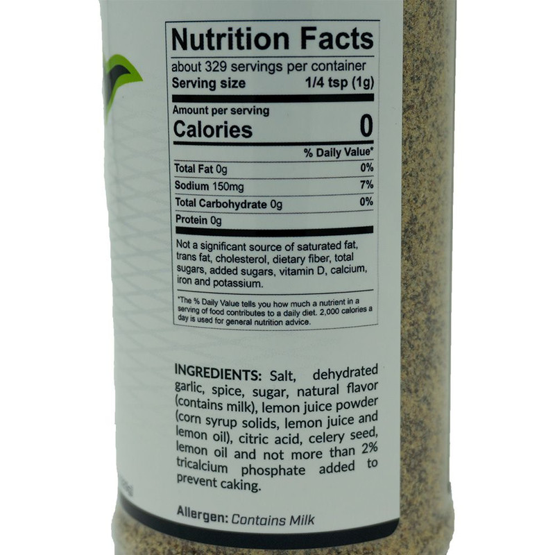 INGREDIENTS: Salt, dehydrated Garlic, spice, sugar, natural flavor (contains milk), lemon juice powder (corn syrup solids, lemon juice and lemon oil), citric acid, celery seed, lemon oil and not more than 2% tricalcium phosphate added to prevent caking.