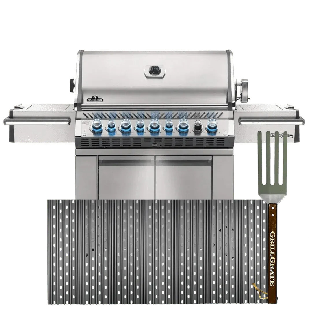 GrillGrates with the GrateTool are the ultimate upgrade to your Napoleon Prestige Pro 665 RSIB. GrillGrates are reversible interlocking panels, giving you two grilling surfaces; rails up or on the flat side. GrillGrates tame flare-ups and even out the hot and cool spots common with all gas grills. This gives you even, stable temperatures across the cooking surface. This set is a drop-in replacement for the stock Prestige Pro 665 RSIB grates. Constructed from hard anodized aluminum, GrillGrates will never rust. Made in the USA. The GrateTool is made in China.