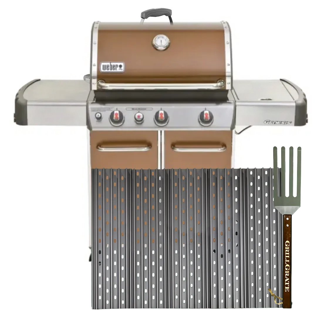 GrillGrates with the GrateTool are the ultimate upgrade to your Weber Genesis®. GrillGrates are reversible interlocking panels, giving you two grilling surfaces; rails up or on the flat side. GrillGrates tame flare-ups and even out the hot and cool spots common with all gas grills. This gives you even, stable temperatures across the cooking surface. This set is a drop-in replacement for the stock Genesis® grates. This set will also fit the Summit® 420 and 470 and many other large gas grills. Constructed from hard anodized aluminum, GrillGrates will never rust. Made in the USA. The GrateTool is made in China.