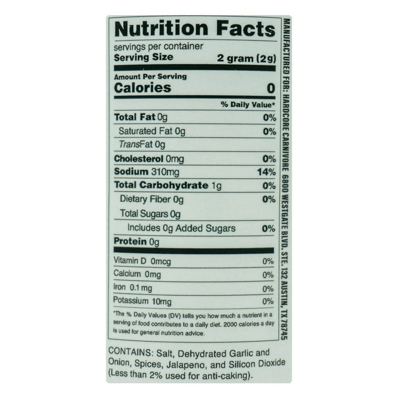 Ingredients: Salt, Dehydrated Garlic and Onion, Spices, Jalapeno, and Silicon Dioxide (Less than 2% used for anti-caking).