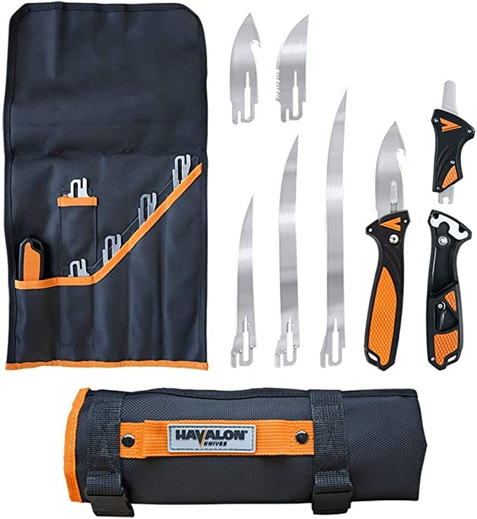The latest innovation from Havalon is here. Introducing the new Havalon Talon featuring the Quik-Change II Interchangeable Cutlery System. Quik-Change II is an internal locking mechanism which allows users to seamlessly change blades without losing any cutting area. The Talon’s adaptable design allows it to fit any style Talon blade big or small with the press of a button. The Talon also features a removable back panel for easy clean up after filleting or processing, and it comes with a rugged nylon roll-pack to store a variety of blade styles and sizes. With an infinite list of uses and possibilities, the Talon is the next evolution in cutlery.