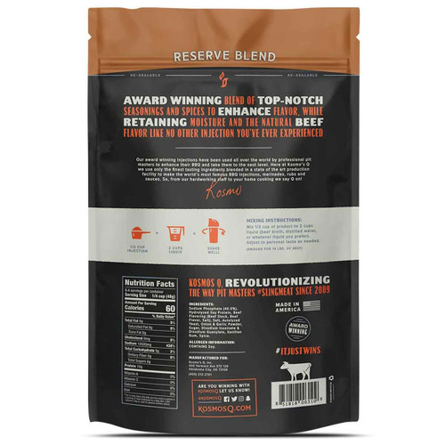 Inject your brisket with the most trusted injection on the market! Our Reserve Blend Brisket Injection is more than an injection and marinade. With thousands of hours of testing and winning brisket competitions worldwide Kosmos Q reserve blend injection not only wins hearts and mouths but money too. With a succulent synthesis of signature spices and moisture-retaining components, combined with slight smoky flavoring and dehydrated beef stock, you can count on producing a mouth-watering tender brisket worthy of even the most seasoned (pun intended) BBQ pitmaster. To truly win a judge’s affections, you need Kosmos Q Meat Injection! So if you are looking for the best brisket injection on the market, you found it.