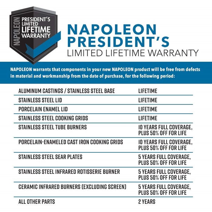 Napoleon offers a Presidents Limited Lifetime Warranty. The aluminum castings, stainless steel base, stainless steel lid, porcelain enamel lid, and stainless steel cooking grids are warranted for a lifetime. The stainless steel tube burners and porcelain-enameled cast-iron cooking grids are warranted for ten (10) years, plus half off for life. The stainless steel sear plates, stainless steel infrared rotisserie burner, and ceramic infrared burners (excluding screen) are warranted for five (5) years, plus half off for life. All other parts are warranted for two (2) years.