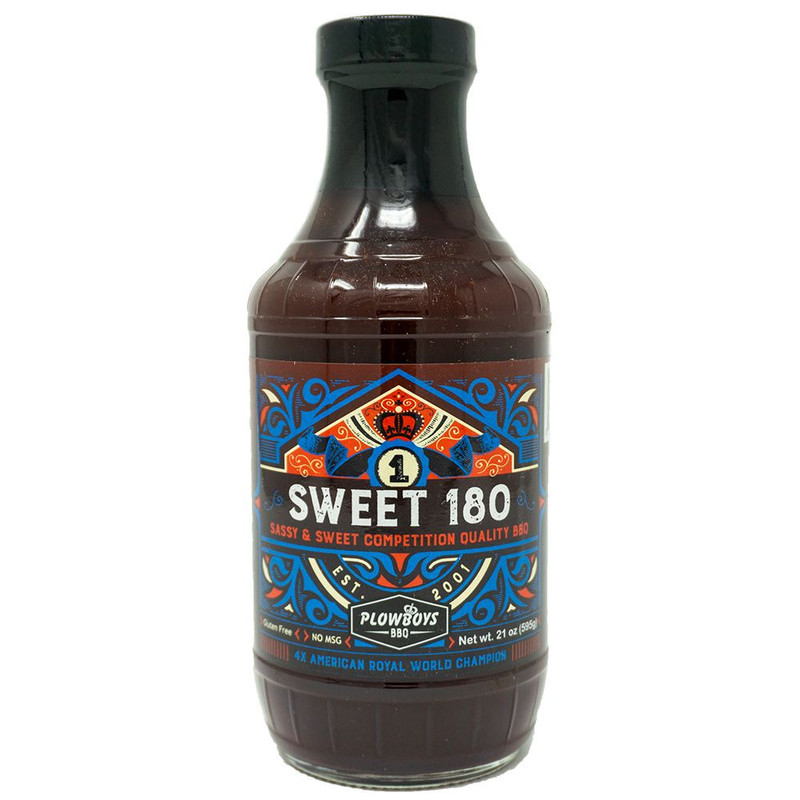 Plowboys BBQ now offers sauces, and Plowboys Sweet 180 BBQ Sauce is the brother to the Plowboys Barbeque EnFuego Spicy sauce. Plowboys Sweet 180 BBQ Sauce is a sassy and sweet competition quality BBQ sauce described as rich, sweet and the kind of little spice kick that will please the BBQ judges or your friends right in your backyard. The low heat is perfect for the general bbq population. Todd Johns, 2009 Grand Champion of The American Royal BBQ Competition  claims that this sauce propelled his team, Pork Pullin Plowboys, to the KCBS 180 Club by helping him achieve a perfect score in chicken. The sauce also goes great on ribs or pork with some Plowboys Yardbird Rub.