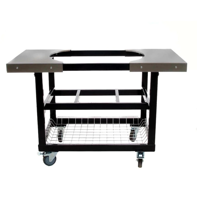This Primo Cart is constructed from powder coated steel and includes 4 heavy-duty casters and a wire basket for your additional storage convenience. This Primo cart makes the perfect addition to any deck or backyard. The side tables extend your work area, allowing you to keep ingredients nearby and the hooks on each shelf provide storage for grilling tools. Four heavy-duty swivel casters roll smoothly on any patio surface and lock in place when you are ready to grill. For use with a Primo Oval XL or Primo Oval Large Kamado-Style Grill.