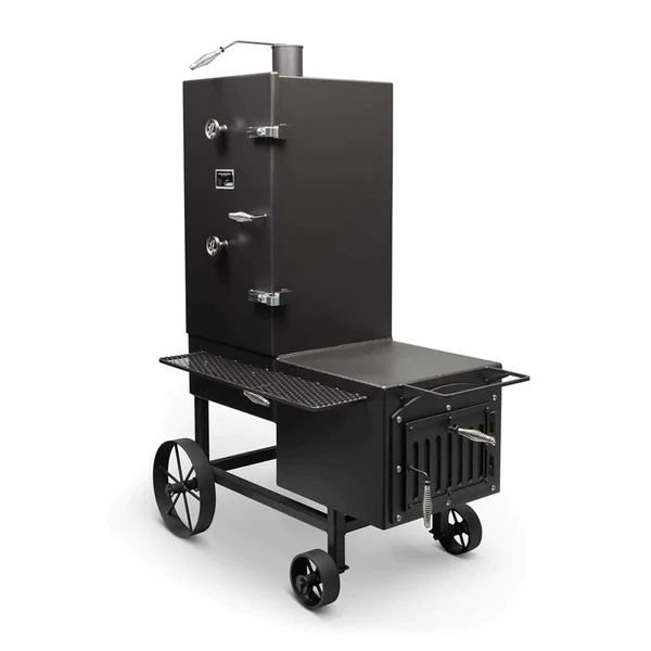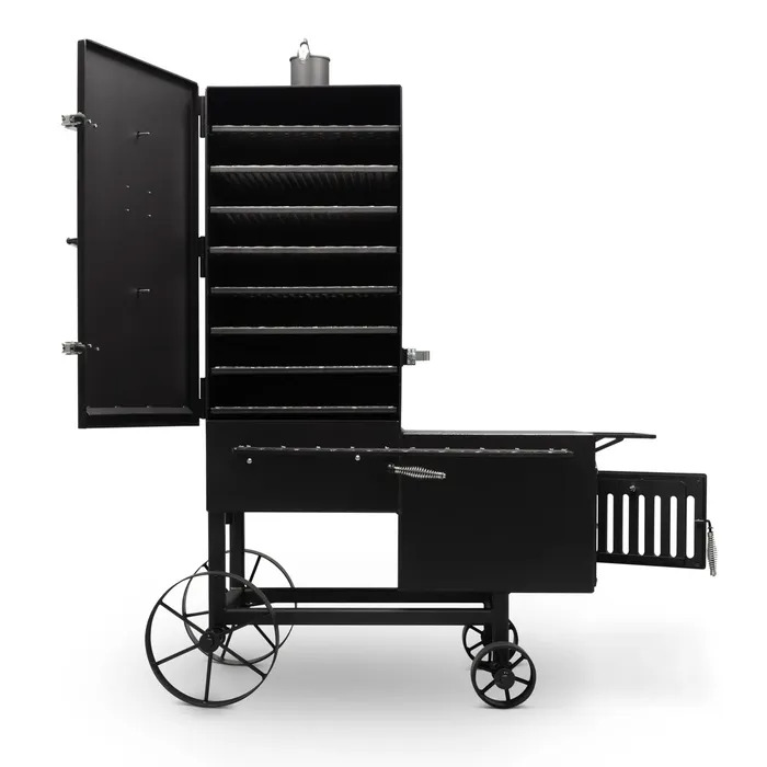 Over and over our customers requested a BBQ pit that delivers a large cooking area in a compact footprint. The Stockton vertical smoker is the answer to this request. With just over 4,300 square inches of cooking surface in a compact space (62″ long x 82″ high x 36.5″ wide), this pit can easily handle 24+ racks of ribs or 16+ pork butts or whatever your friends or customers desire. The Stockton is fitted with eight, two foot square racks positioned 4″ apart. Load all eight or remove every other rack to increase cooking height. This design is as versatile as your cooking requirements are varied.